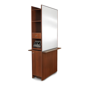 SINGLE OR DOUBLE STYLING STATION PERFECT FOR STYLING OR MAKEUP MADE IN CANADA HALF MIRROR WITH SHELF APPLIANCE HOLDER WITH PLUG IN STORAGE SHELVES, DRAWERS AND CUPBOARDS DIMENSIONS 78X34X13 INCHES HIGH-QUALITY FINISH 3 COLORS AVAILABLE