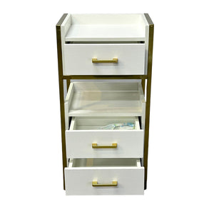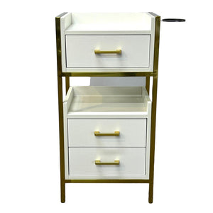 Combining elegance and functionality, the Esthetic White and Gold Trolley is perfect for salons, spas, and beauty parlors. Featuring a sleek white finish with gold framing, this trolley offers both style and ample storage. With three drawers, it provides easy access to your tools and supplies, making it an essential addition to any beauty or esthetician workstation.