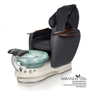 The base is unlike any other. The appealing shape, combined with many choices of sparkling glass bowl colours, links with the unique design of a pedicure chair with a relaxing upper body massage.