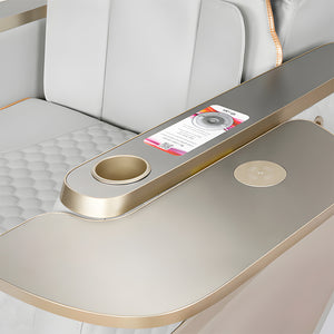 – Wireless cellphone charging on the oversized gold armrest tray.