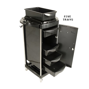 This portable Trolley has it all. Locking metal door secures five removable drawers, each of which is 8 1/2″ x 13″ x 3 1/4″. Accommodates blow dryer, curling irons, color bowl...