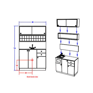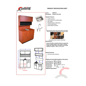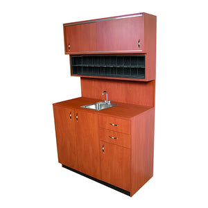 Color Center w/ stainless steel sink. Additional features include overhead storage w/ sliding doors in aluminum door track, acrylic color storage cubbies, two drawers, two storage cabinets w/ shelves, and spring-hinged access door to soiled-towel bin. 48″W x 21″D x 79″H. Total of 22 color cubbies Each color cubbie measures 3 7/8″W x 4 1/2″H x 7 5/8″D