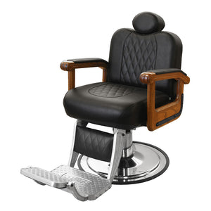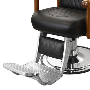 The world class Cavalier Barber Chair, with solid oak arms, is GUARANTEED to provide years of comfort and service. The oak lasts forever, the durable metal-to-metal construction includes 8 sets of ball-bearings for smooth operation and long-life, and the sealed hydraulic base includes an over-sized ultra-hick steel base plate. The Cavalier is built to last, and ships fully assembled. Made 100% in the U.S.A Gas-Cylinder Controlled Reclining Back Cushion Right & Left Handed Controls for Back Recline Adjustable-Removable Push-Button Headrest Cast Aluminum Footrest Works IN-SYNC w/ Back Recline Cast Aluminum Extended Footrest Roll-Over Calf-Pad Foot-Operated USA Made Heavy-Duty Hydraulic Base 27” Diameter 10 Gage Steel Powder-Coated Baseplate Durable Powder-Coated Fabricated Steel Frame 8 Sets of Ball-Bearings for Long Life & Smooth Operation Real Red Oak Arms 1/ Padded Upholstered Rests Guaranteed for 10 Years of 100,000 Haircuts Specifications