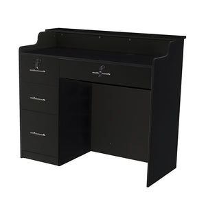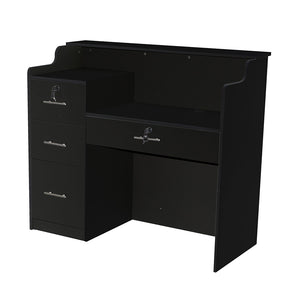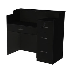 This reception desk is designed to either be a sit-down or stand behind a desk. It includes storage cubbies for quick access.