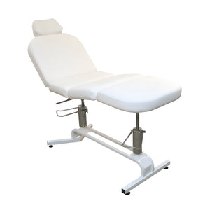 There are esthetic changes in the bed stitching as from the picture. Please contact your salesperson for pictures. This elegantly styled elite white facial bed has thick foam foot, seat and back rest cushions covered with an easy-to-keep-clean and comfortable white PVC vinyl material for years of durability. The facial bed features a face cut-out pillow and fully removable armrests (without screws or nuts). With adjustable head, back and leg rests, the back of the chair is adjustable upward for customer comfort, and the footrest is adjustable downward. Features also include a heavy duty metal base and hydraulic pump, and the bed swivels 360 degrees. This is truly a very versatile tattoo table and is ideal for tattooing, body piercing, facials, skin care or massage.