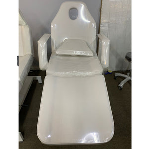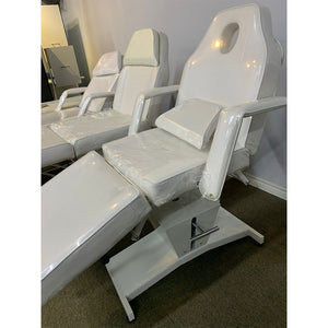 There are esthetic changes in the bed stitching as from the picture. Please contact your salesperson for pictures.This elegantly styled elite white facial bed has thick foam foot, seat and back rest cushions covered with an easy-to-keep-clean and comfortable white PVC vinyl material for years of durability. The facial bed features a face cut-out pillow and fully removable armrests (without screws or nuts). With adjustable head, back and leg rests, the back of the chair is adjustable upward for customer comfort, and the footrest is adjustable downward. Features also include a heavy duty metal base and hydraulic pump, and the bed swivels 360 degrees. This is truly a very versatile facial table and is ideal for facials, skin care, massage or body piercing.