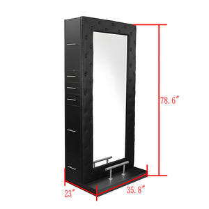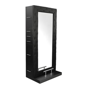 The Elizabeth Single-sided styling station is a polished and contemporary model. Featuring a large tufted mirror, tons of storage, and chrome footrests, this styling station is a client favourite. Tufted PVC combinations double stying stations, with a big full-length mirror, beautiful tufted PVC combinations, large storage, stainless steel footrest, the hole for outlet and appliance rings.
