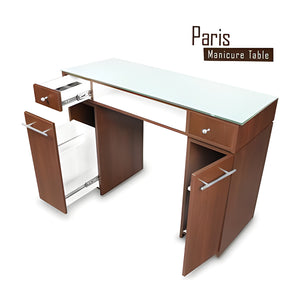 The Paris Nail table is perfect. Comes with elegant glass top and modern curves. Has excellent storage compartments and drawers. Helps nail techs stay organized and keep their stations clean throughout the day.