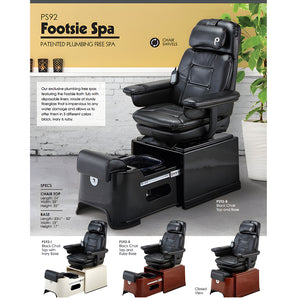PS92 Plumbing Free Pedicure Spa Features Our exclusive plumb free spas featuring the footsie bathtub with disposable liners. Made of sturdy fiberglass that is impervious to any water damage. Chair Base...