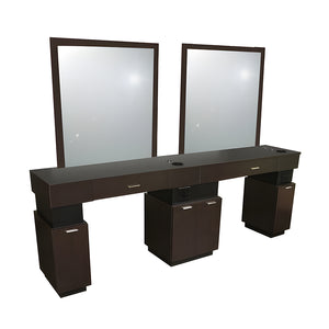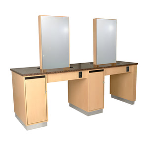 Quad Student Station. Each student has mirror, tool holders, duplex electrical outlet, and storage cabinet with padlock hasp. Measures 96″L x 32″D x 36″H x 66″H. Reference 73578.634