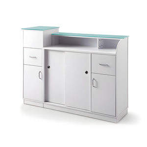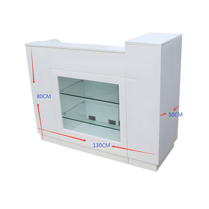Reception Desk with Display and Glass TopAvailable in White melamine onlyMeasurements: 53 W x17 Lx 43.5 H