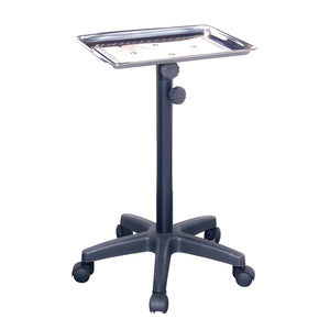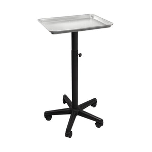 Multipurpose – Perfect for salons, studios, shops and professional offices looking for a high quality instrument and product tray. • Fully adjustable – The height of the swiveling tray adjusts easily from 28″ to 44″ (measured from floor to top of tray) and is locked in place via the tension knob, making this suitable for use while seated or standing. • Sturdy – Includes strong pedestal base with 2” diameter powder-coated aluminum riser and 5 composite legs (21” diameter base). Smooth-rolling, swivel casters provide superb mobility and allow the tray to be positioned close to your working area for maximum efficiency. Casters are non-marring to protect your floor from marks. • Premium aluminum tray – Tray measures 18” x 13” and is made from high-grade aluminum; thicker and less lightly to warp than steel trays. Edge of tray features a 1” tall lip to secure the tray’s contents and provides a barrier against accidental spills. Tray is easily removable for cleaning and sanitizing.