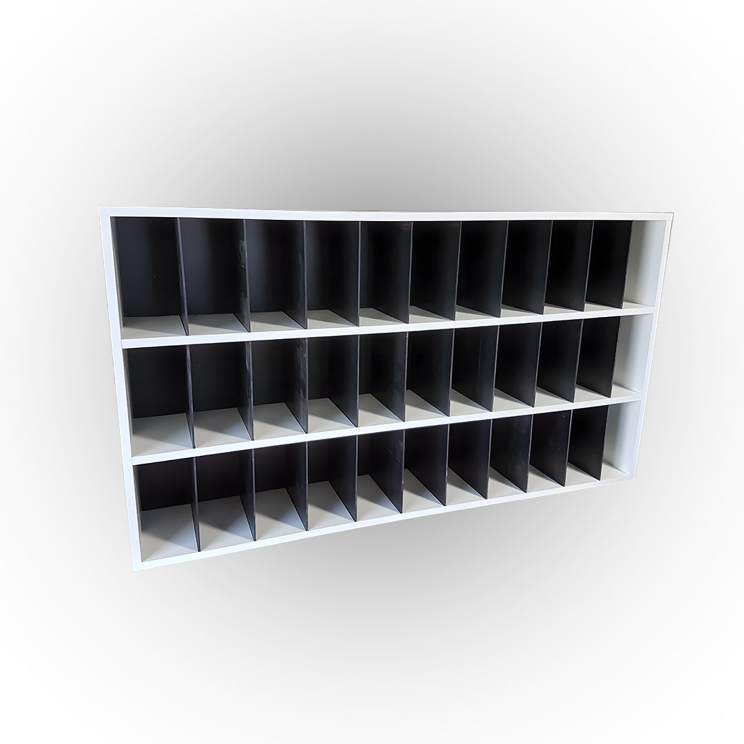 33 color spots Color cubbies available in 2 or 3 rows Made in Canada 48 inches W x 18 inches H x 7.5 inches D or 27 inches H Available in black , brown, white, maple , cherry